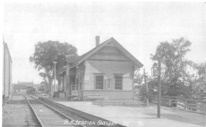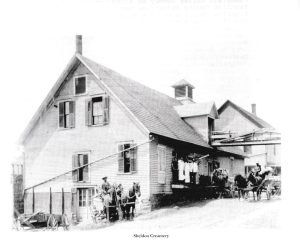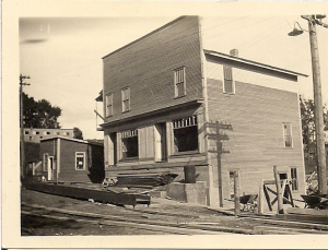 In the rear is the Alden Brother’s Creamery. Note the horizontal line running to the right which actually joins the railroad siding to the creamery building.