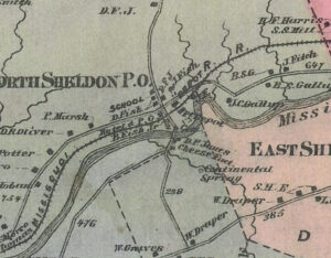 The Beers map of 1871 shows the location of this rural cemetery in a small but seemingly prosperous North Sheldon. Note on the map, focused on the four corners that are now the intersection of Rte. 105 and Rte. 120, such items as a Post Office, a School, the cemetery, Continental Springs, a cheese factory and one or two depots along with many residents of Fish and Gallup.