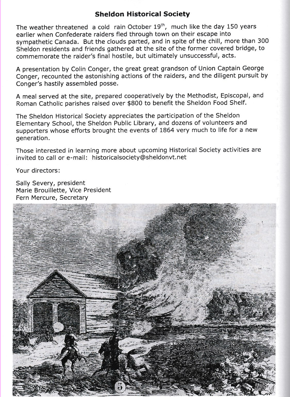After raiding Saint Albans and robbing several banks, The Confederate Raiders as they were called, proceeded to attempt an excape to Canada that did eventually succeed. However, in Sheldon they first attempted to burn down the two-lane covered bridge over Bridge Street. The local minister is credited with putting out that fire. The Raiders then attempted to rob The Missisquoi Bank which was closed. They theb proceeded east and north into Canada