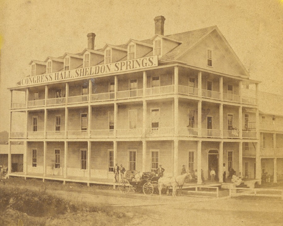Congress Hall is the name of a new house built and owned by Dr. S. .S Fitch of New York, who is the principal owner of Sheldon Spring. It stands near the Spring, just a little off the plank road from St. Albans to Sheldon and is about a half a mile from the Missisquoi House. Not longer ago than last April a small dwelling house occupied its site and its material was in the lumber yards and the stores. On the 20th of July it was open, was speedily filled with guests and has since turned several away for want of room. It is 30 x 90, three stories high, contains 38 sleeping rooms and has a L 18 X 26 in which the kitchen and store room are located. Each story opens on a spacious veranda, which affords and excellent promenade and view of wild and romantic scenery surrounding. The house is very plain, but a better table is not found often anywhere……..