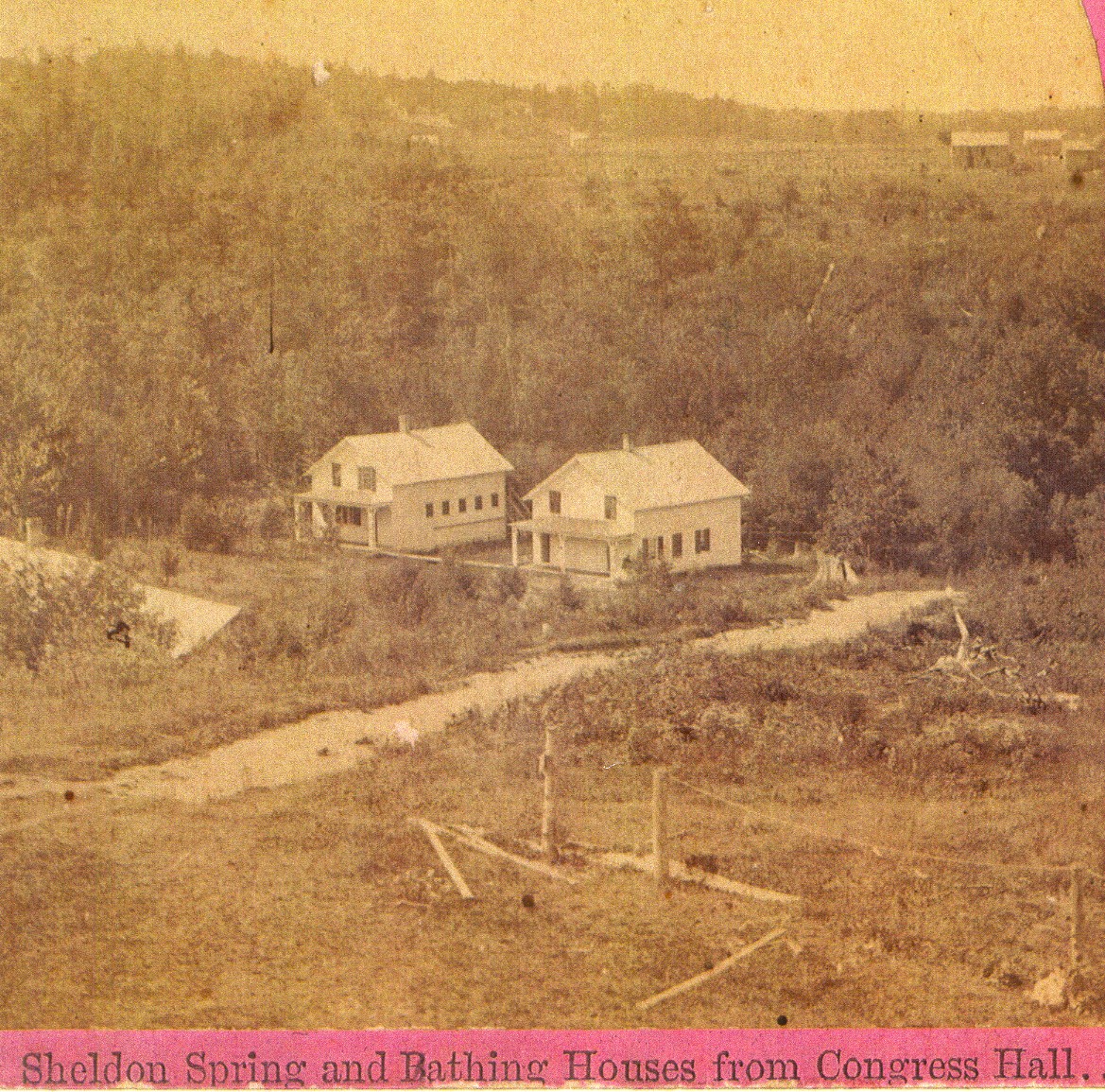 Directly to the west of the Congress Hall stood one bottling plant and two bath houses shown to the right. They stood at a location near the current Sheldon Town Waste facility. The “Hall” can be seen here in the left foreground. The path comes off the St. Albans to Richford plank road. The spring, still in existence, produced up to 1,000 gallons of water each day by virtue of a wind mill pumping water for the bath houses, the Hall and for bottling. Manifests of the time show hundreds of crates of water shipped worldwide.